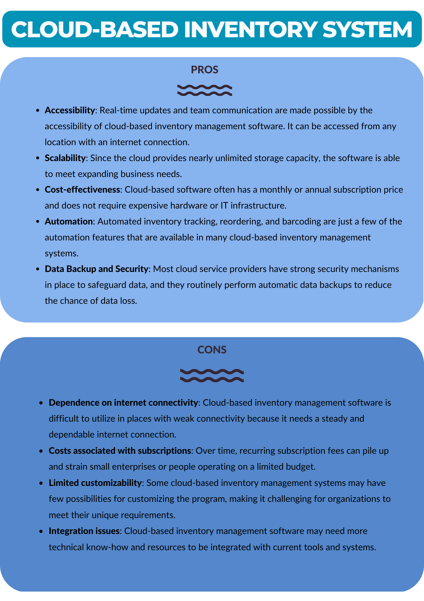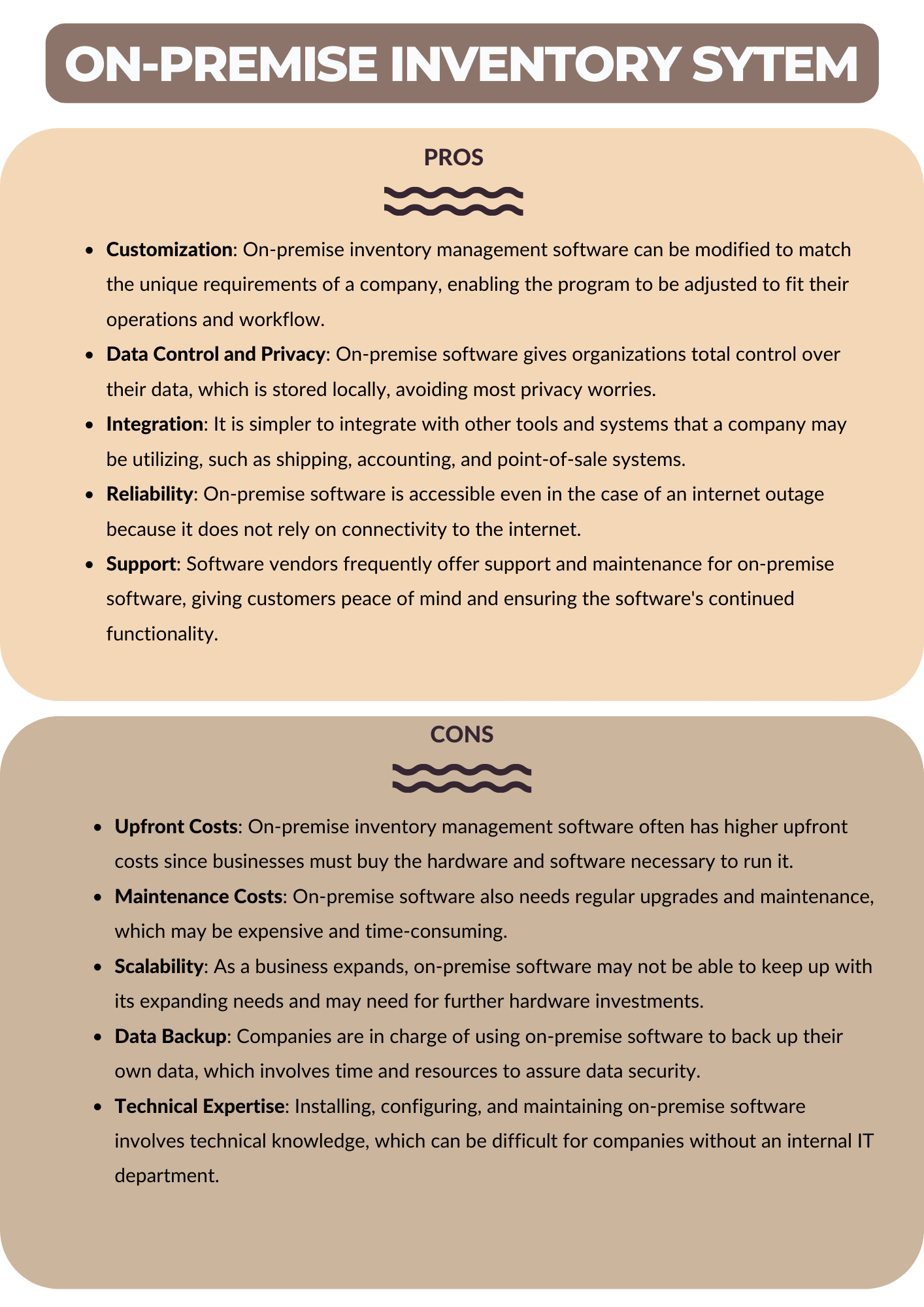 Below are some of the pros and cons of an on-premise and cloud-based inventory management system: