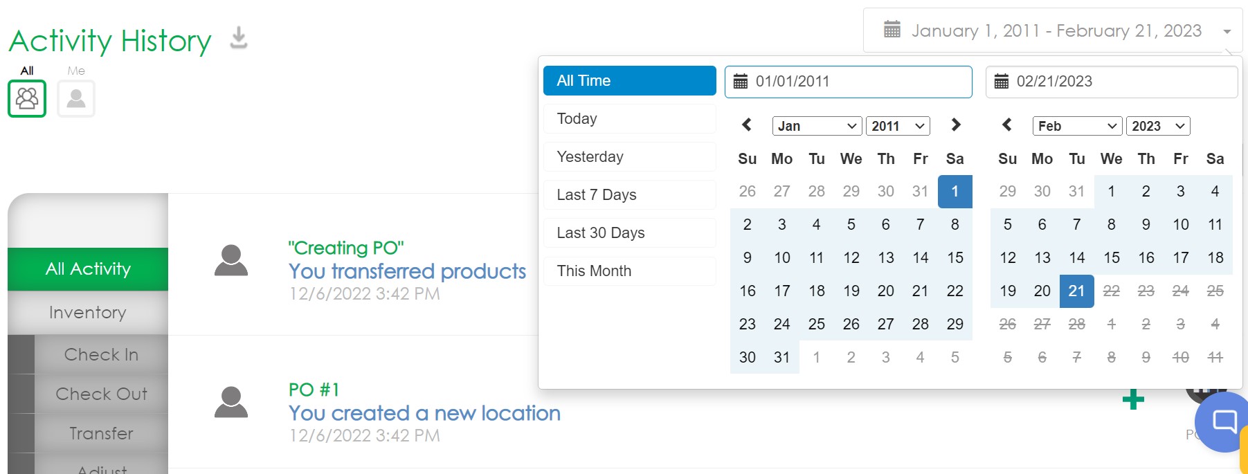 CyberStockroom’s activity history function lets you keep track of inventory changes and movement over time. This will help you spot trends in your inventory and troubleshoot any problems that could recur. In the top right side corner of your CyberStockroom account, click on the button that looks like a clock, and it will take you to the activity history page.