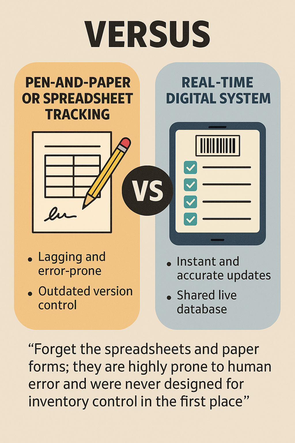 In contrast, a real-time digital system updates instantly with each scan or entry, and it maintains an error-free history. There’s no ambiguity about handwriting or version control – everyone sees the same live database. As one inventory solution provider bluntly put it, “forget the spreadsheets and paper forms; they are highly prone to human error and were never designed for inventory control in the first place”. Real-time systems are purpose-built for this task.