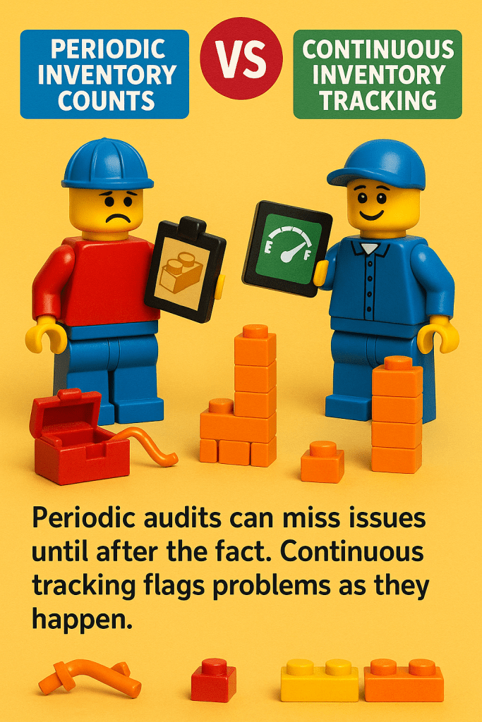 Some companies conduct inventory checks once a week or at project milestones to get a handle on their supplies. While periodic audits can catch discrepancies eventually, they don’t prevent problems in between. You might discover on Friday that you’re low on copper wire, but that doesn’t help if you actually ran out on Wednesday and lost productive time.