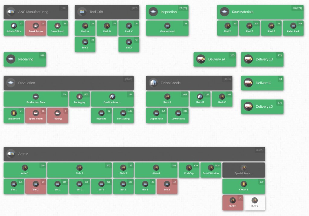 - Visual Inventory Mapping: Instead of sifting through spreadsheets or textual lists, CyberStockroom lets you create a virtual map of your operation. You can lay out your warehouse zones, production floor, storage rooms, whatever makes sense for your business – and see inventory levels in each area at a glance. This visual approach reduces confusion. For example, if a part is supposed to be at “Station A” and isn’t, you can quickly see if it’s sitting in “Bulk Storage” or another sub-location.