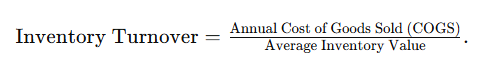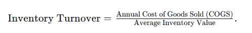 A simpler conceptual way: turnover = how many times you cycle through your inventory. For example, if you had $1,000,000 in average inventory and your COGS for the year was $4,000,000, then $4M/$1M = 4. That means you turned your inventory over 4 times in the year (roughly one turn every 3 months).