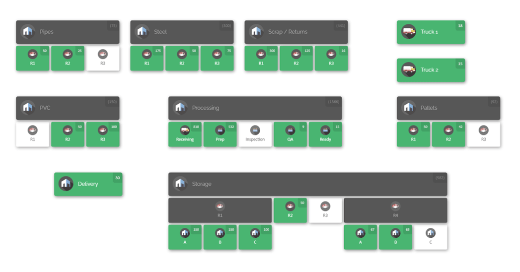 - colour-coded location states (empty, populated, partially populated via sub-locations)